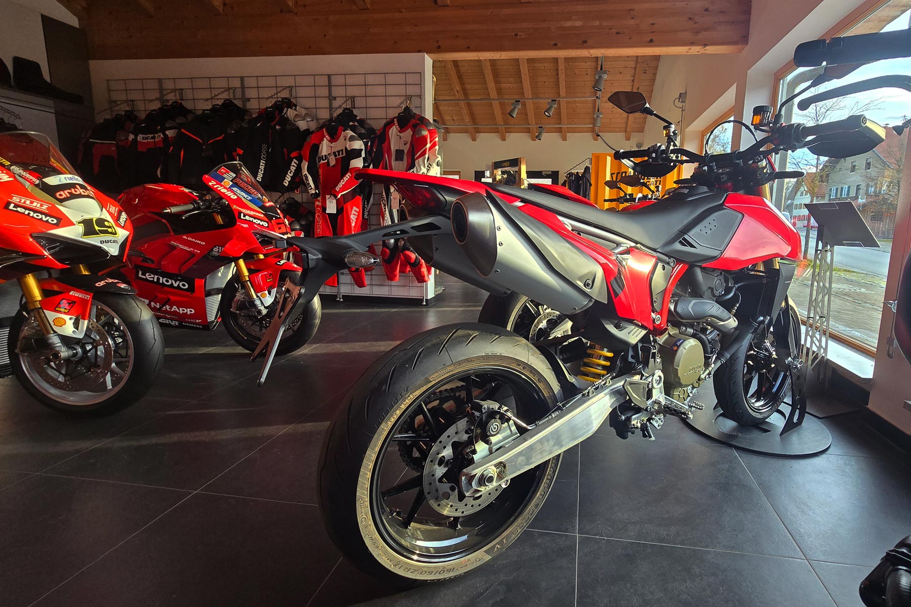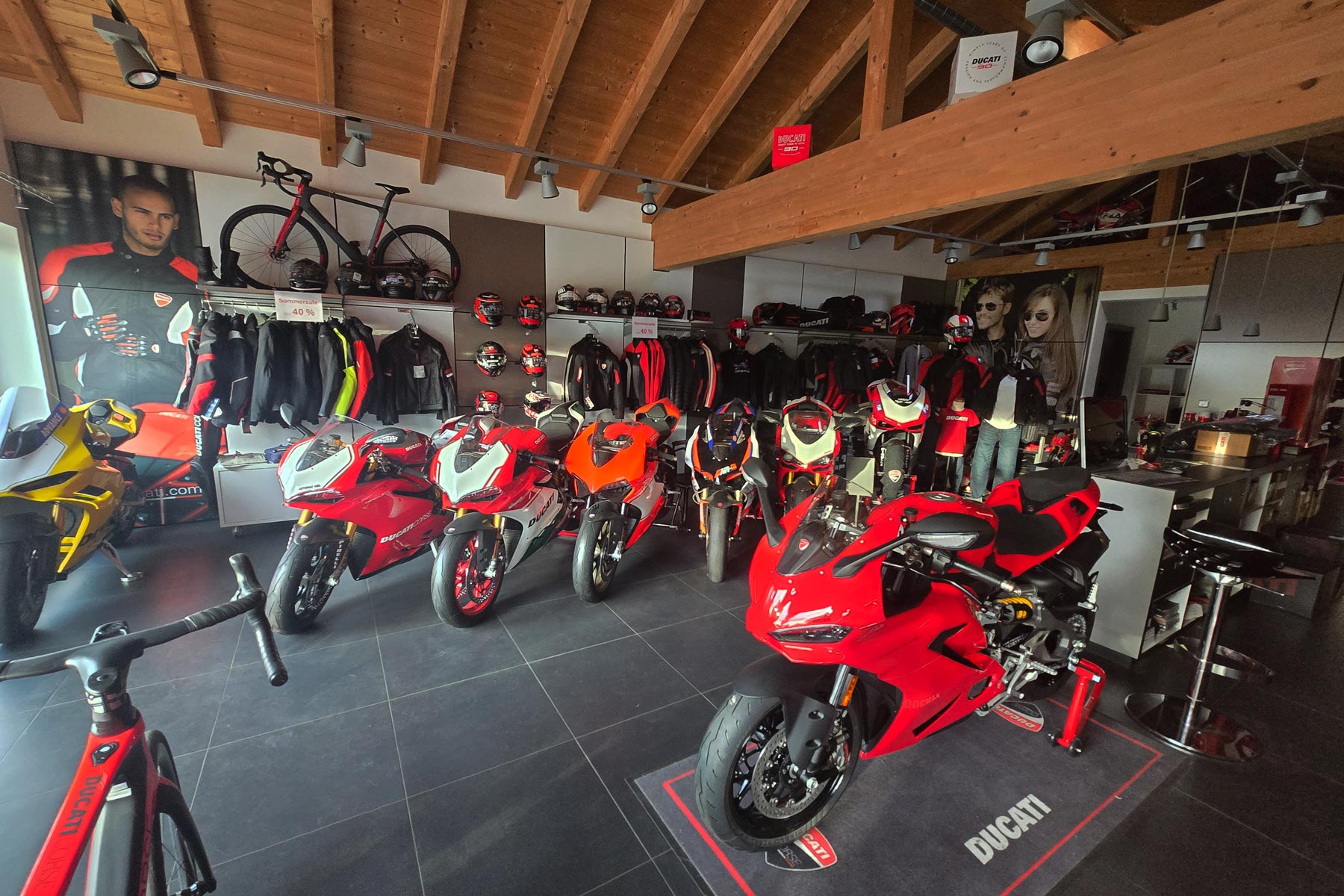 Mit 200 m² Ausstellungsfläche gehört unser Motorradladen zu den spezialisierten Ducati-Shops. Wir präsentieren Dir die ganze Welt des Ducatifahrens. Die Neu- und Gebrauchtfahrzeugausstellung, der integrierte Bekleidungs- und Zubehörshop bieten viel aus der Ducati-Welt. In unserem Verkaufsraum bieten wir Ihnen alles rund um das Motorrad, wie Bekleidung, Helme, Accessoires und vieles mehr.