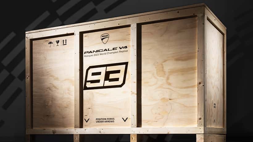 Marquez Startnummer 93 prangt nicht nur auf der Verkleidungsfront, sondern zudem auf der speziellen Holzkiste, in der die Ducati Panigale V4 Marquez 2025 World Champion Replica geliefert wird.