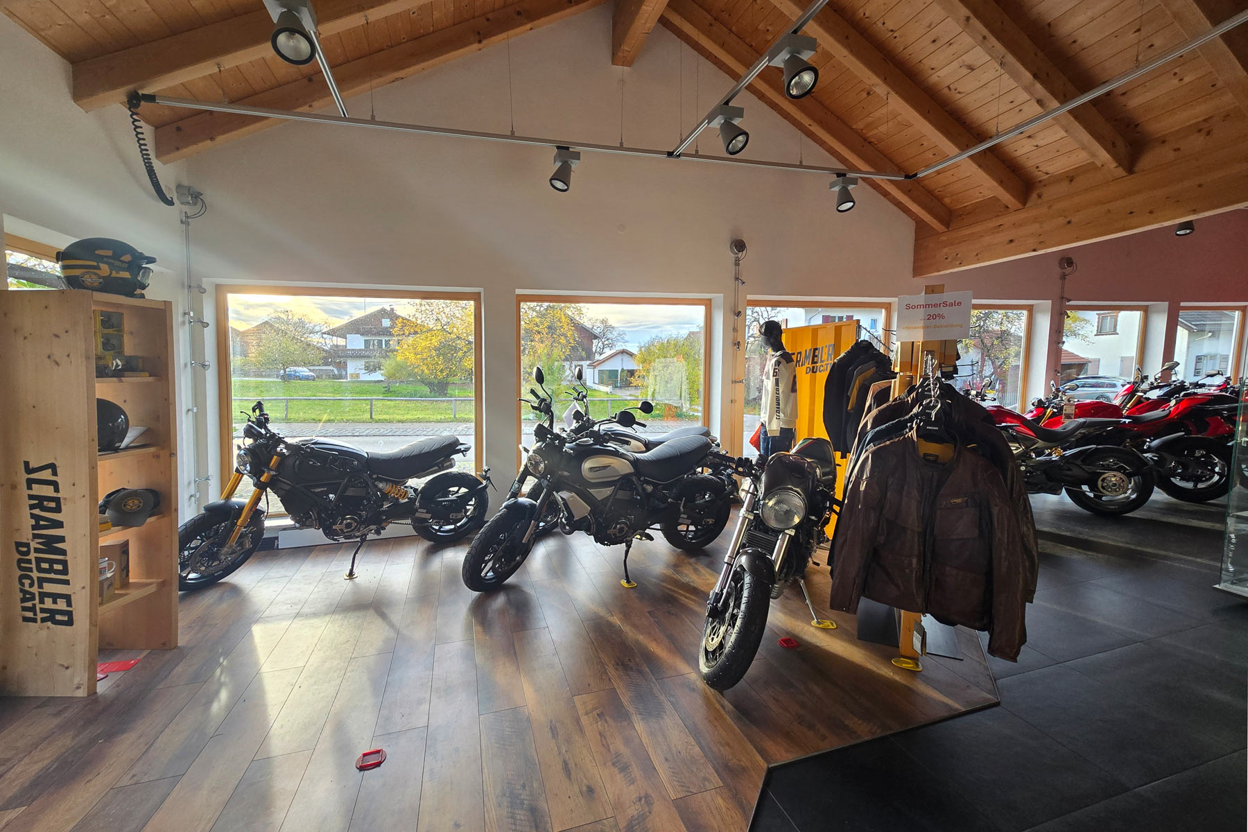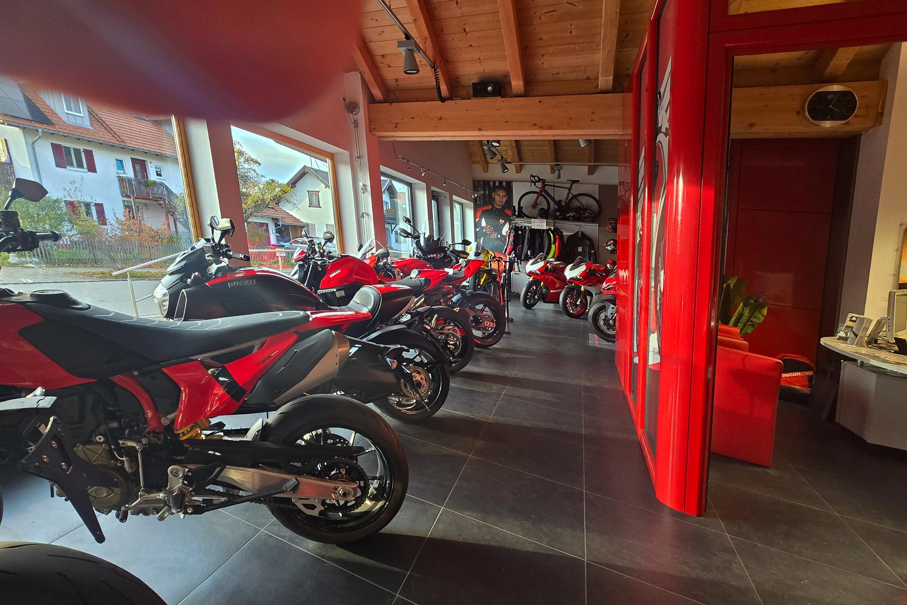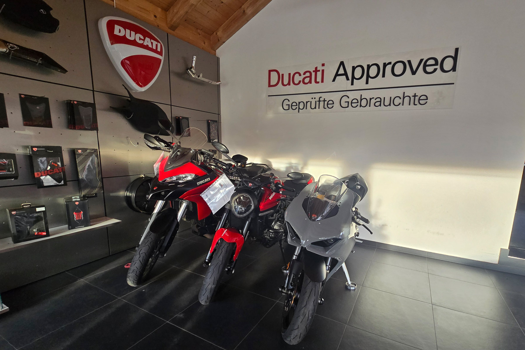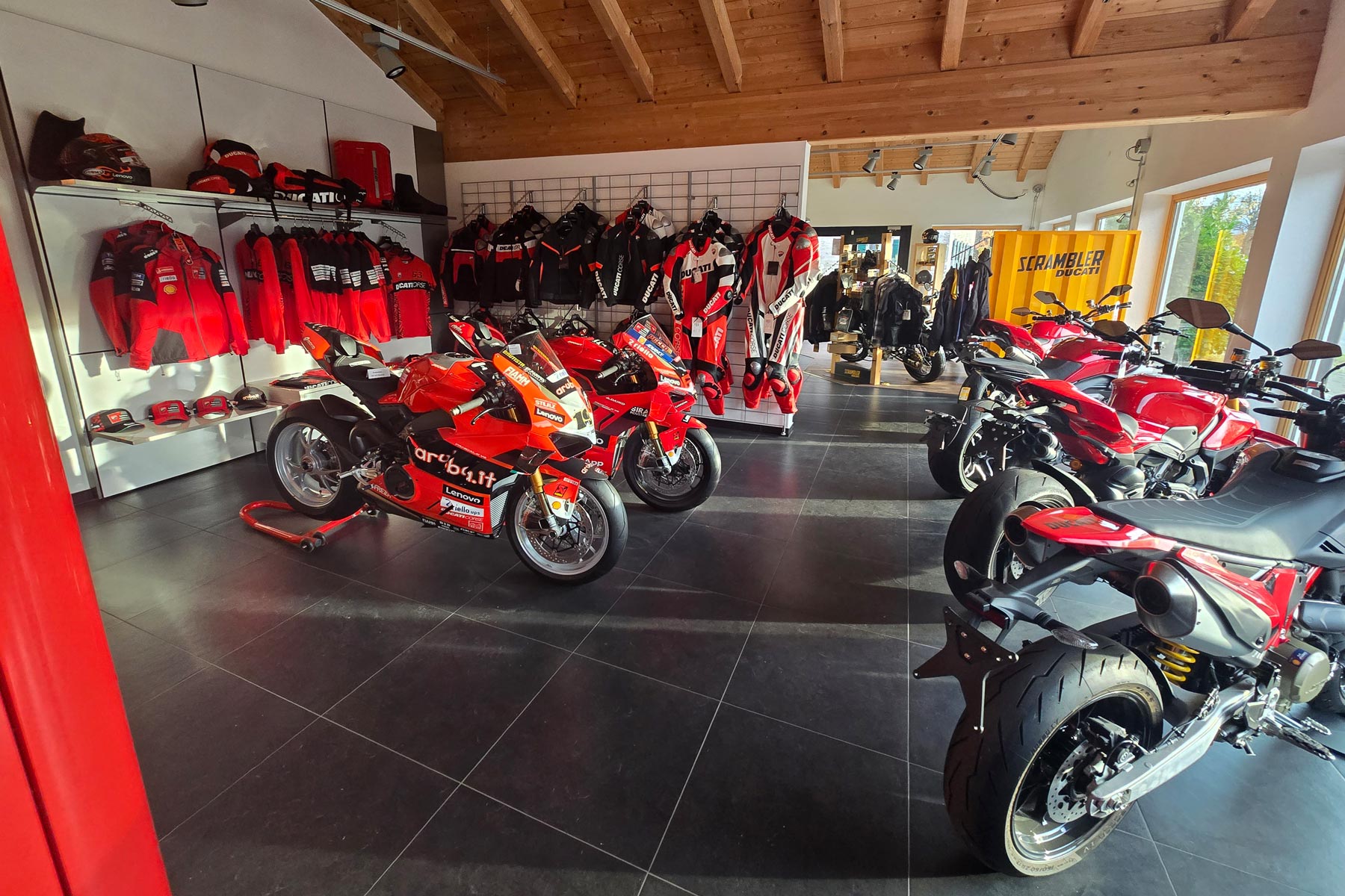Mit 200 m² Ausstellungsfläche gehört unser Motorradladen zu den spezialisierten Ducati-Shops. Wir präsentieren Dir die ganze Welt des Ducatifahrens. Die Neu- und Gebrauchtfahrzeugausstellung, der integrierte Bekleidungs- und Zubehörshop bieten viel aus der Ducati-Welt. In unserem Verkaufsraum bieten wir Ihnen alles rund um das Motorrad, wie Bekleidung, Helme, Accessoires und vieles mehr.
