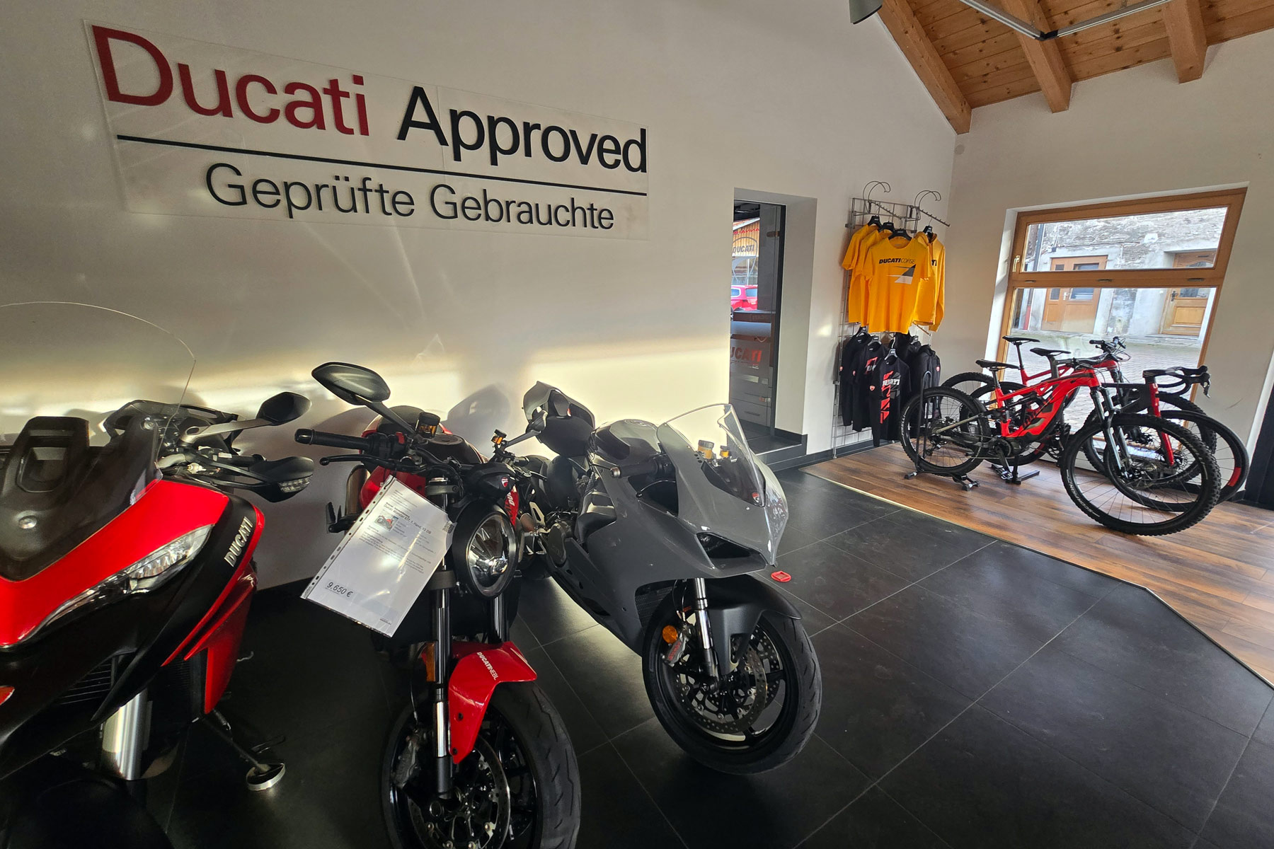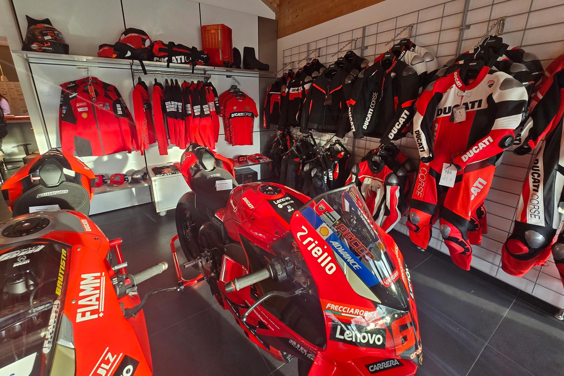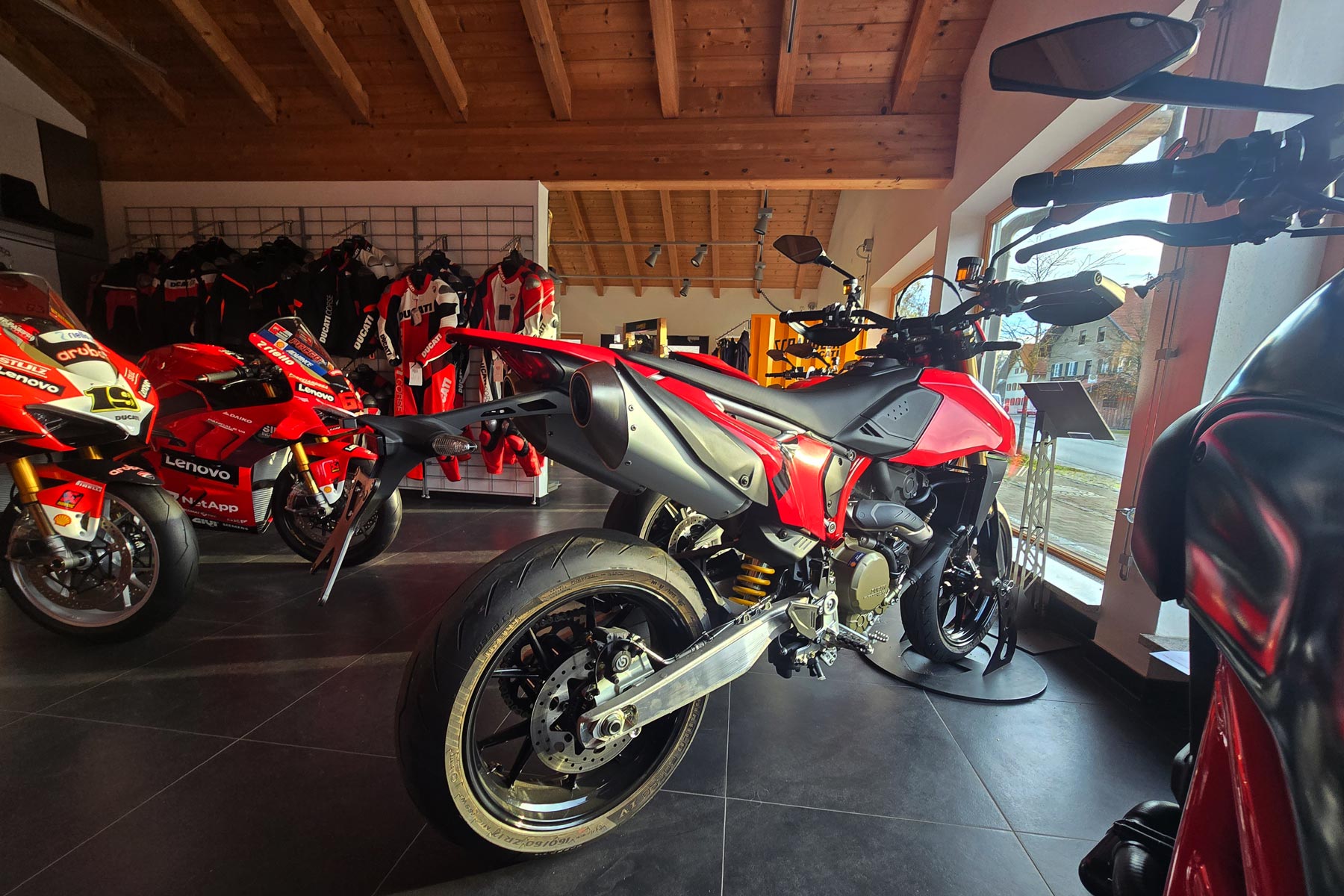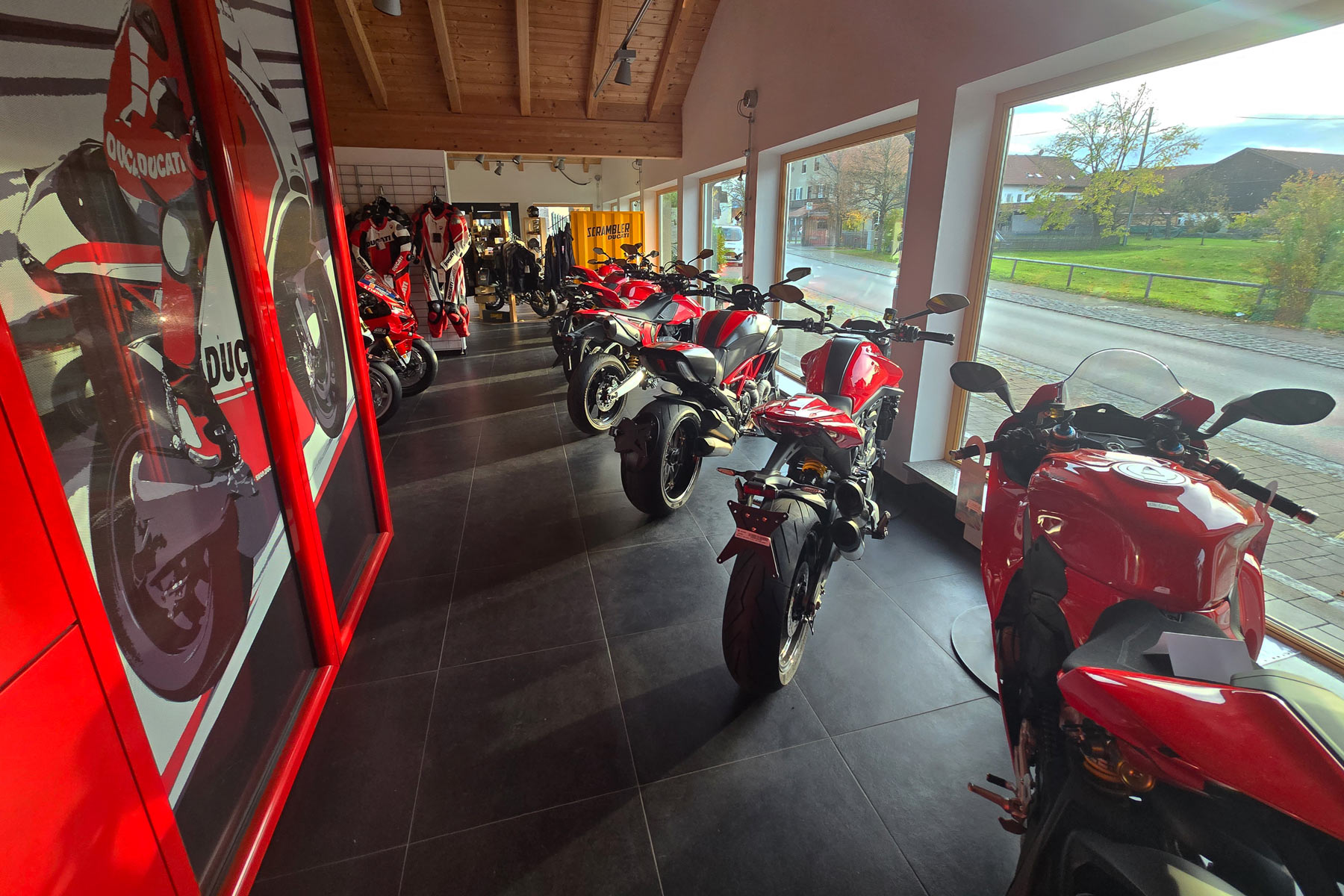 Mit 200 m² Ausstellungsfläche gehört unser Motorradladen zu den spezialisierten Ducati-Shops. Wir präsentieren Dir die ganze Welt des Ducatifahrens. Die Neu- und Gebrauchtfahrzeugausstellung, der integrierte Bekleidungs- und Zubehörshop bieten viel aus der Ducati-Welt. In unserem Verkaufsraum bieten wir Ihnen alles rund um das Motorrad, wie Bekleidung, Helme, Accessoires und vieles mehr.
